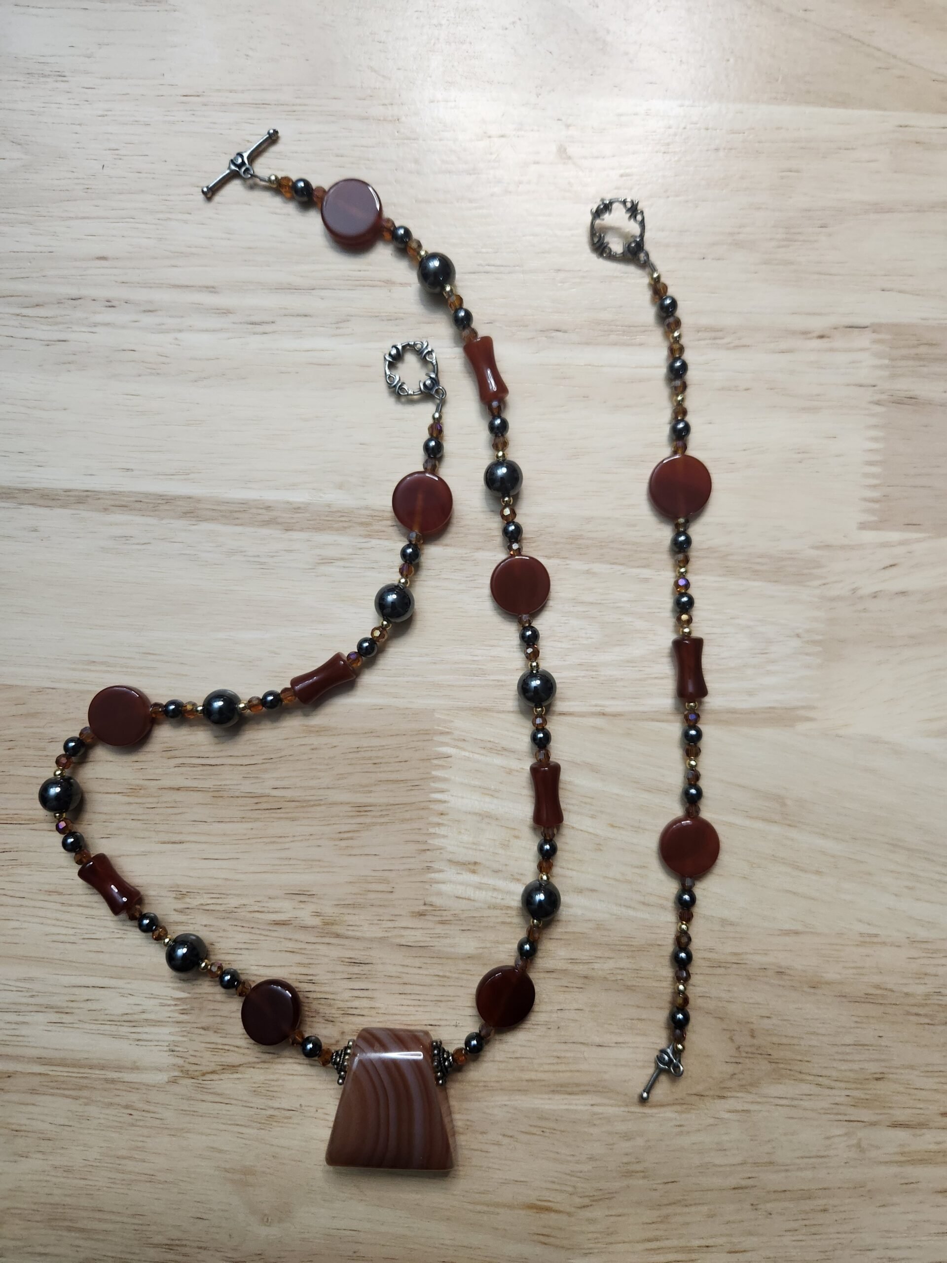 Celebrate the perfect balance of fire and earth with this captivating three-stone necklace and bracelet set. Vibrant carnelian brings warmth and energy, while intricate agate adds natural patterns and grounding beauty. Sleek hematite completes the trio with its polished metallic sheen, creating a sophisticated interplay of textures and tones. This thoughtfully curated collection offers versatility—wear the pieces together for maximum impact or separately to suit your mood. Whether you’re drawn to carnelian’s passionate glow, agate’s organic charm, or hematite’s modern edge, this set delivers layered sophistication with an effortlessly cool aesthetic.