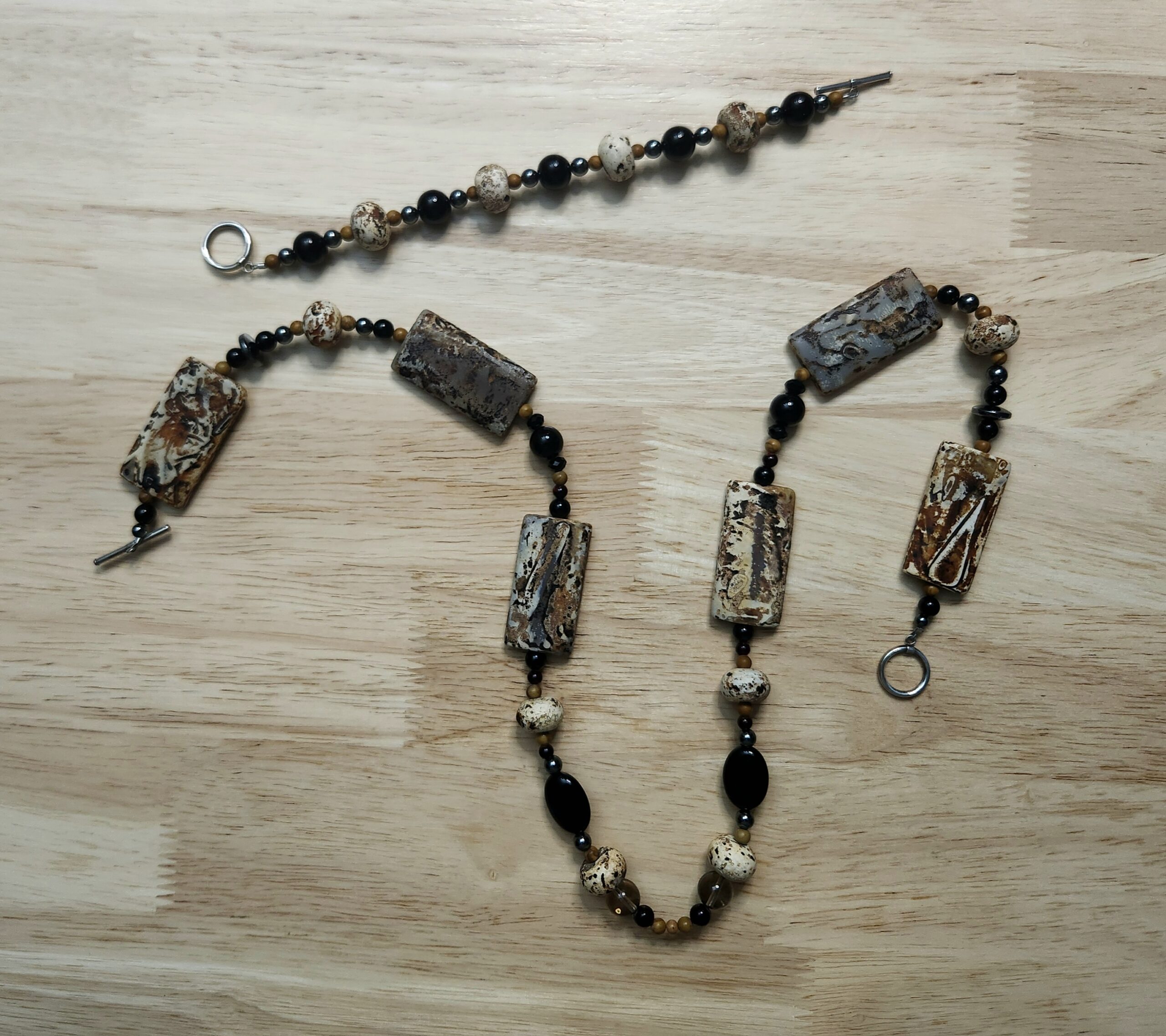- Sterling Silver Clasp | Chinese Crystals | Wood Jasper | Hematite | Fossilized Bone | Pearlized Beads | Onyx | Smoky Quartz
