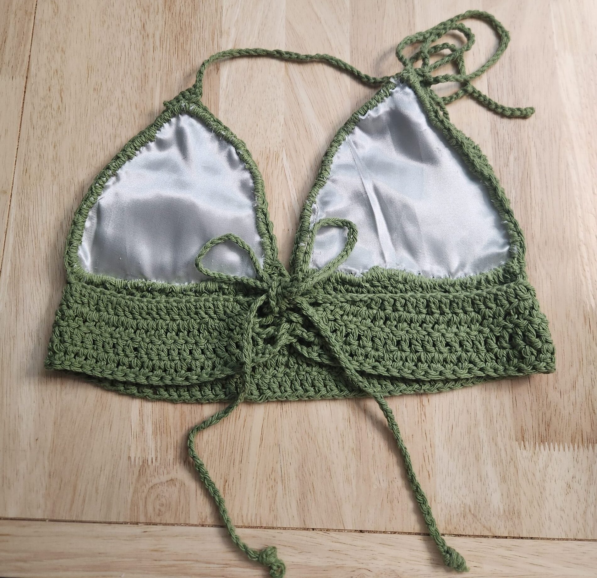This handcrafted Crochet Bralette was created using 100% cotton yarn and a satin lining.